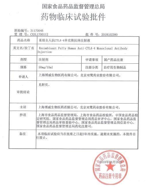 日前,博威生物与北京双鹭药业股份有限公司联合申报的生物制品二类新药——“重组全人抗CTLA-4单克隆抗体注射液”获得了国家食品药品监督管理总局(CFDA)签发的临床批件,苏州华测生物技术有限公司(简称“华测生物”)承接了此药品的临床前研究。