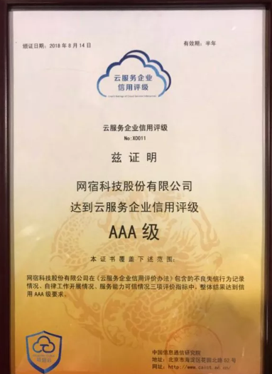 8月14日,在“2018可信云大会”上,网宿科技获得可信云首批颁发的最高级AAA级云服务企业信用评级,这意味着网宿科技云主机超过50%的可用区已经获得了可信云五星+最高级别认证。